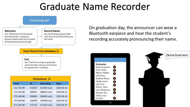 Everyone who is tasked with announcing graduate names is worried of mispronouncing the names of their esteemed graduates. It has happened to all of us as we look down on the student's name card and cannot decipher the correct pronunciation. The larger the school, the more likely this will happen. Let's try to eliminate some of the guesswork. How about we have the graduate call a phone number and be prompted to enter their student ID and then record their first and last name which will allow the announcer to wear a Bluetooth earpiece and hear the proper pronunciation of the graduate's name ahead of reading their name aloud.